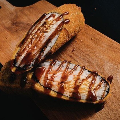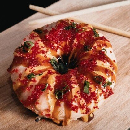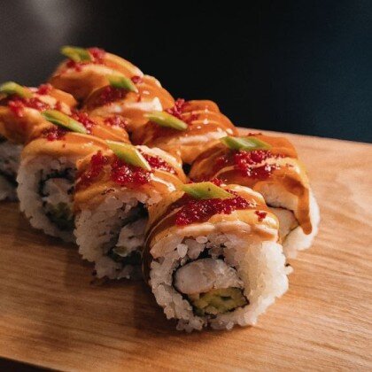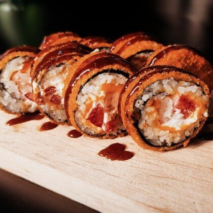 Рис, нори, сыр креметто, лосось слабосоленый, краб. Шапочка из огурца, поливается унаги соусом.